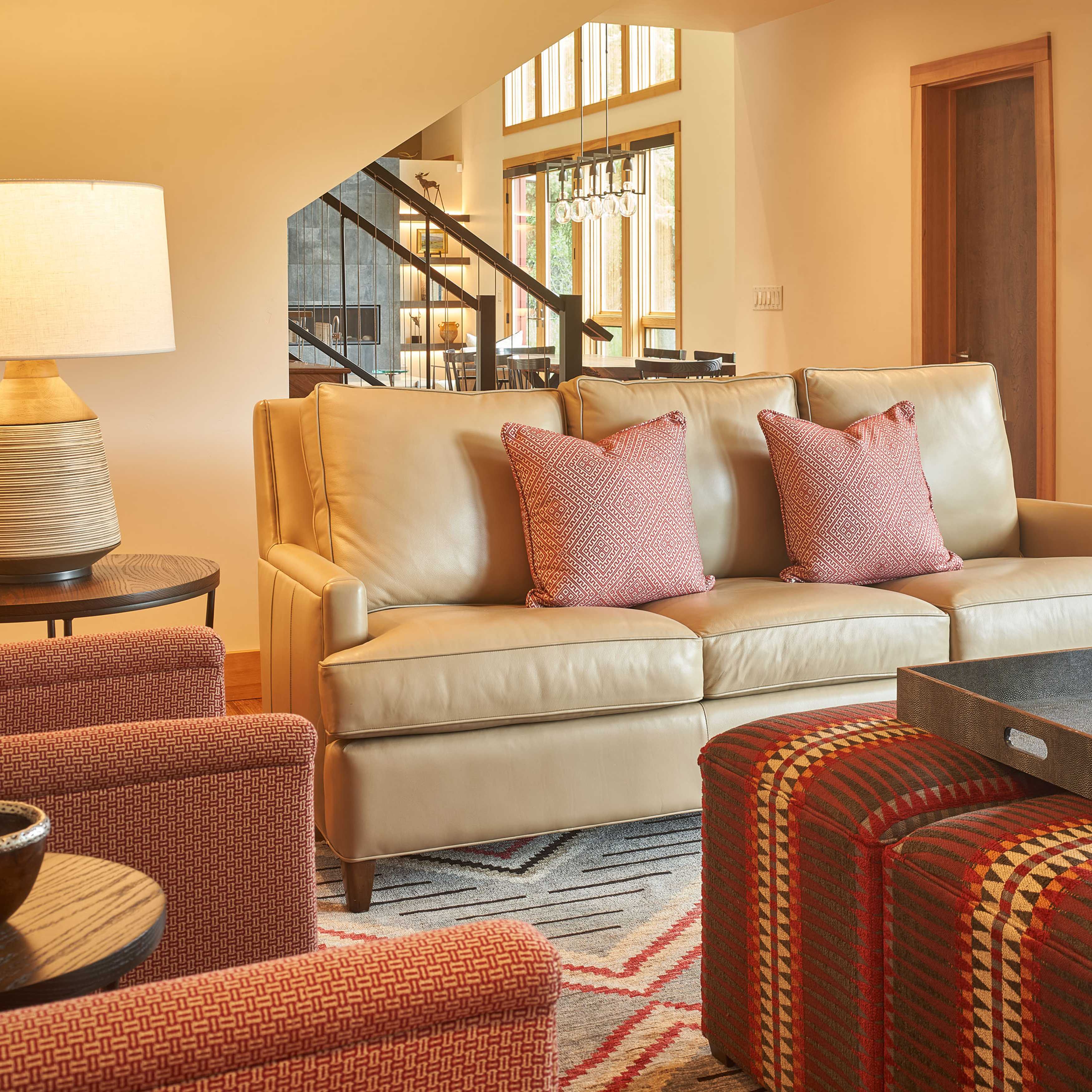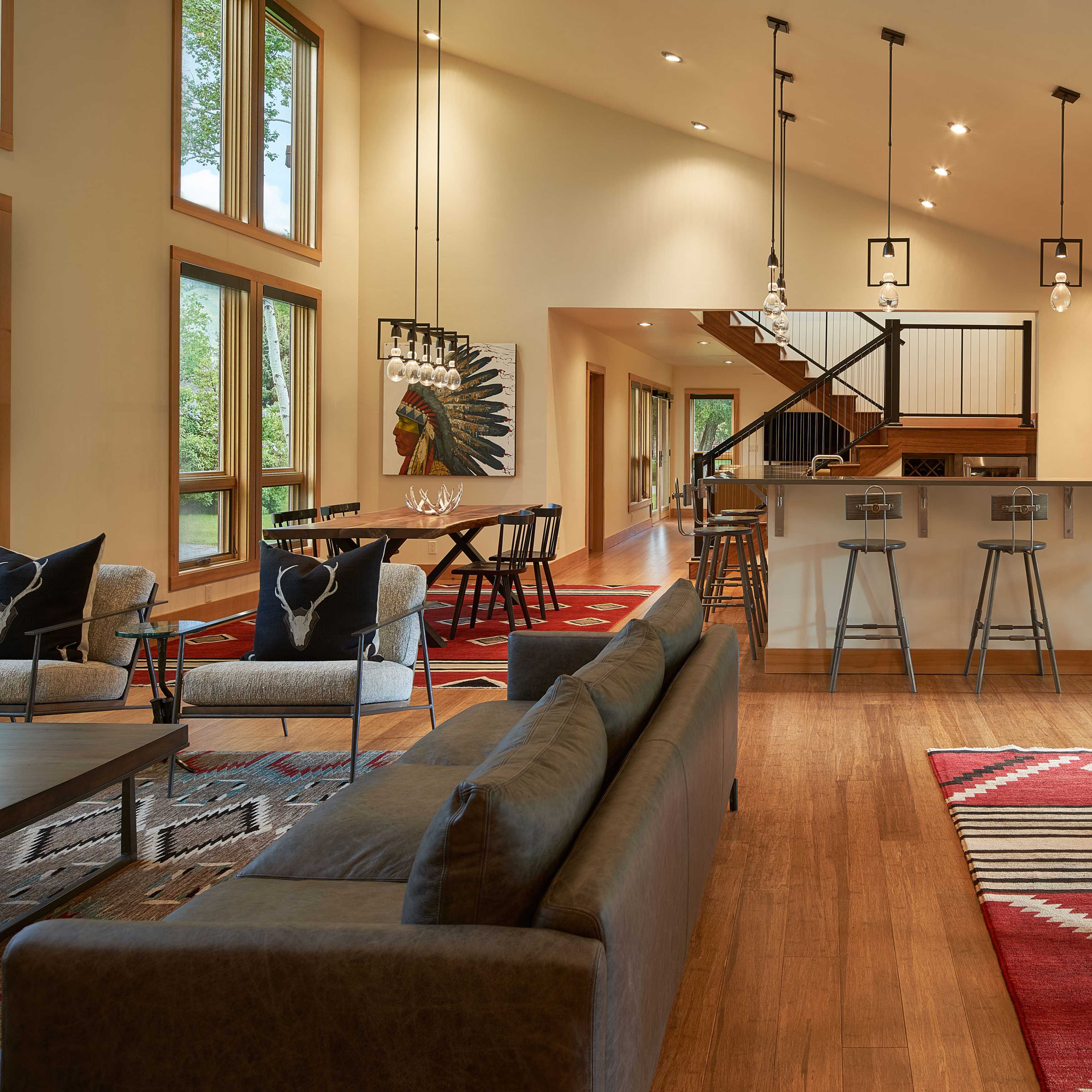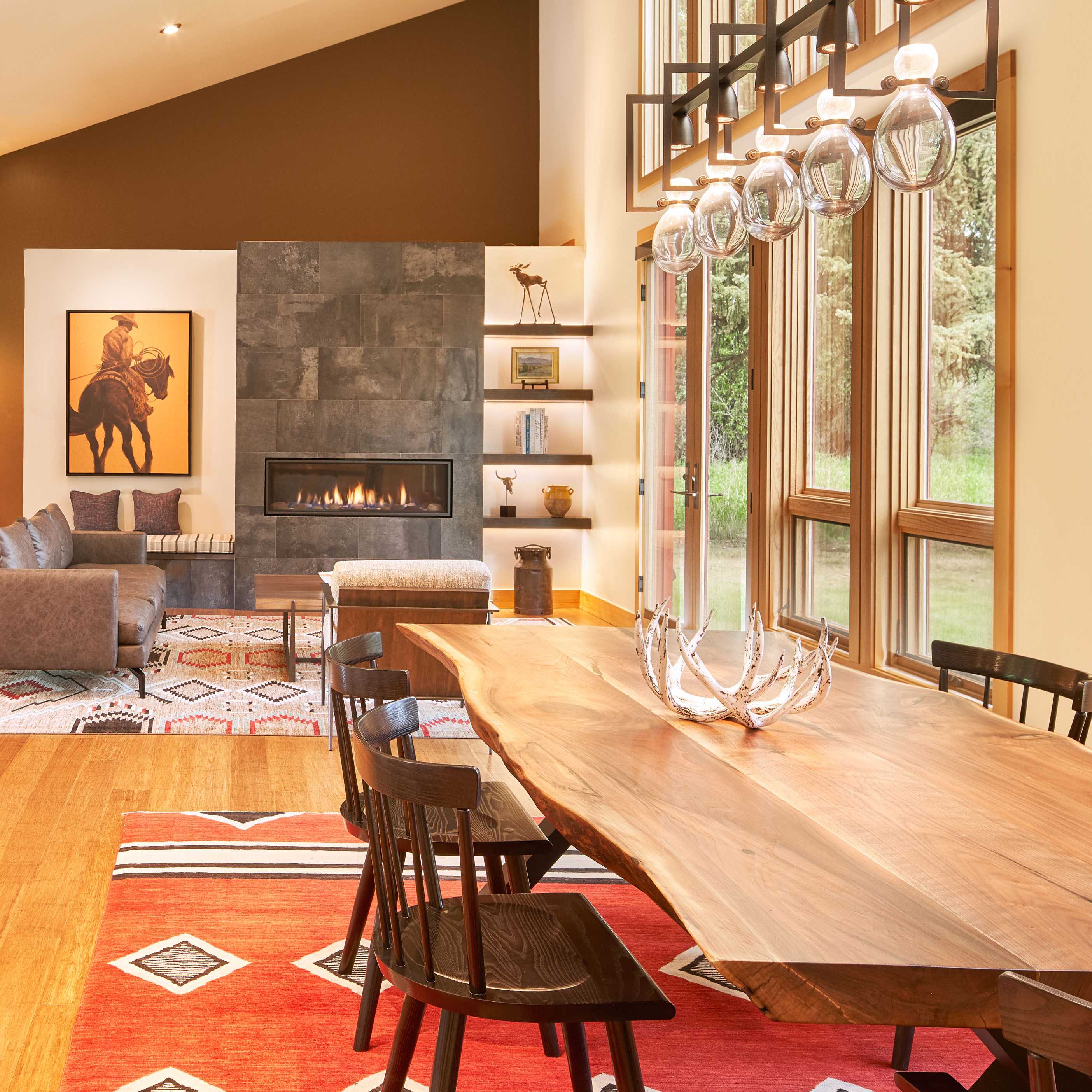 COLOR!! Our design started by adding pattern and color to the blank palette with bright area rugs that grounded the spaces. In the large great room, we created an architectural focal point with the linear fireplace and built-in bench and shelves. This provided a comfortable area for our clients to entertain guests. The comfortable furnishings throughout this spacious residence were a mix of modern, industrial, and retro-inspired. The contemporary western artwork brought in just the right amount of Jackson Hole flavor.