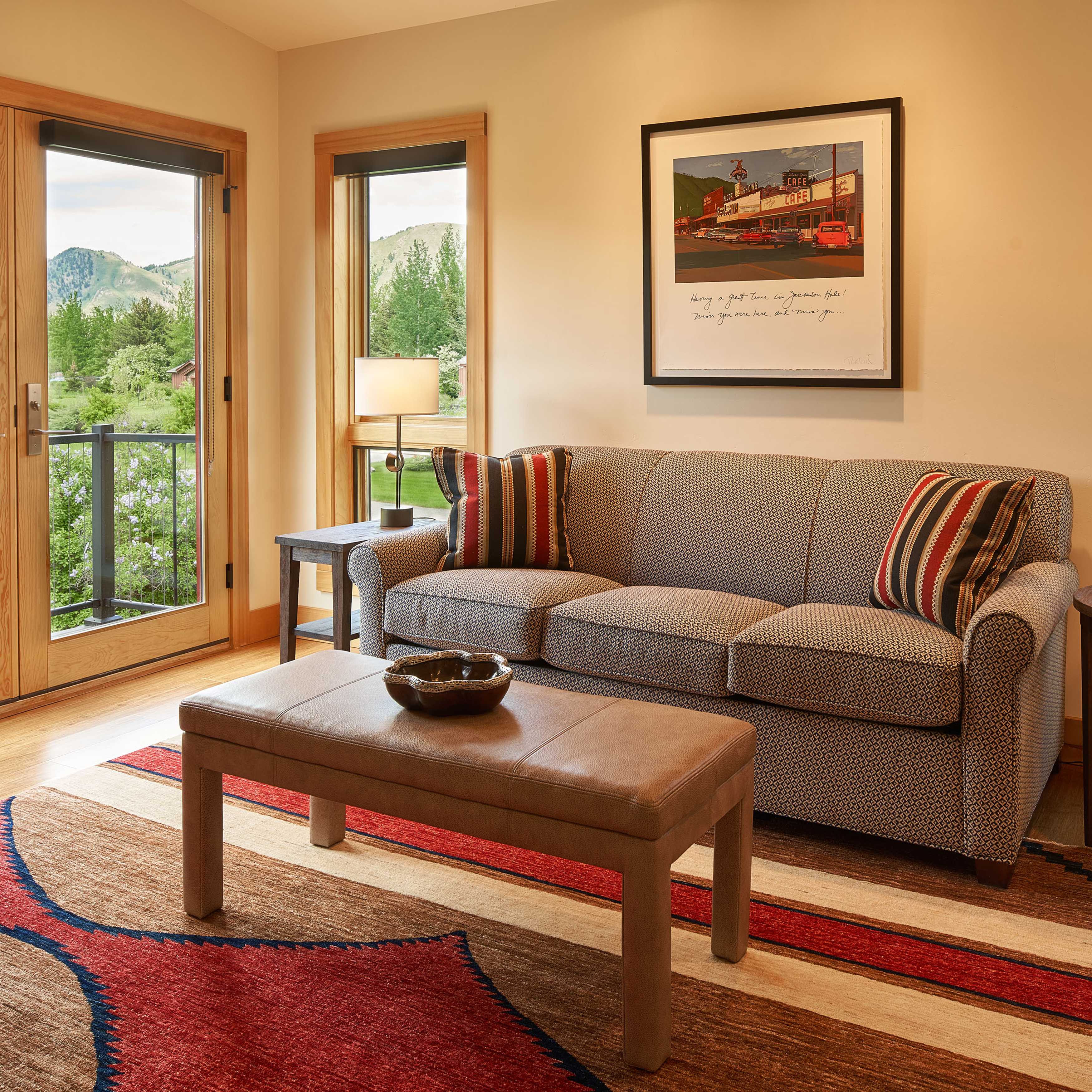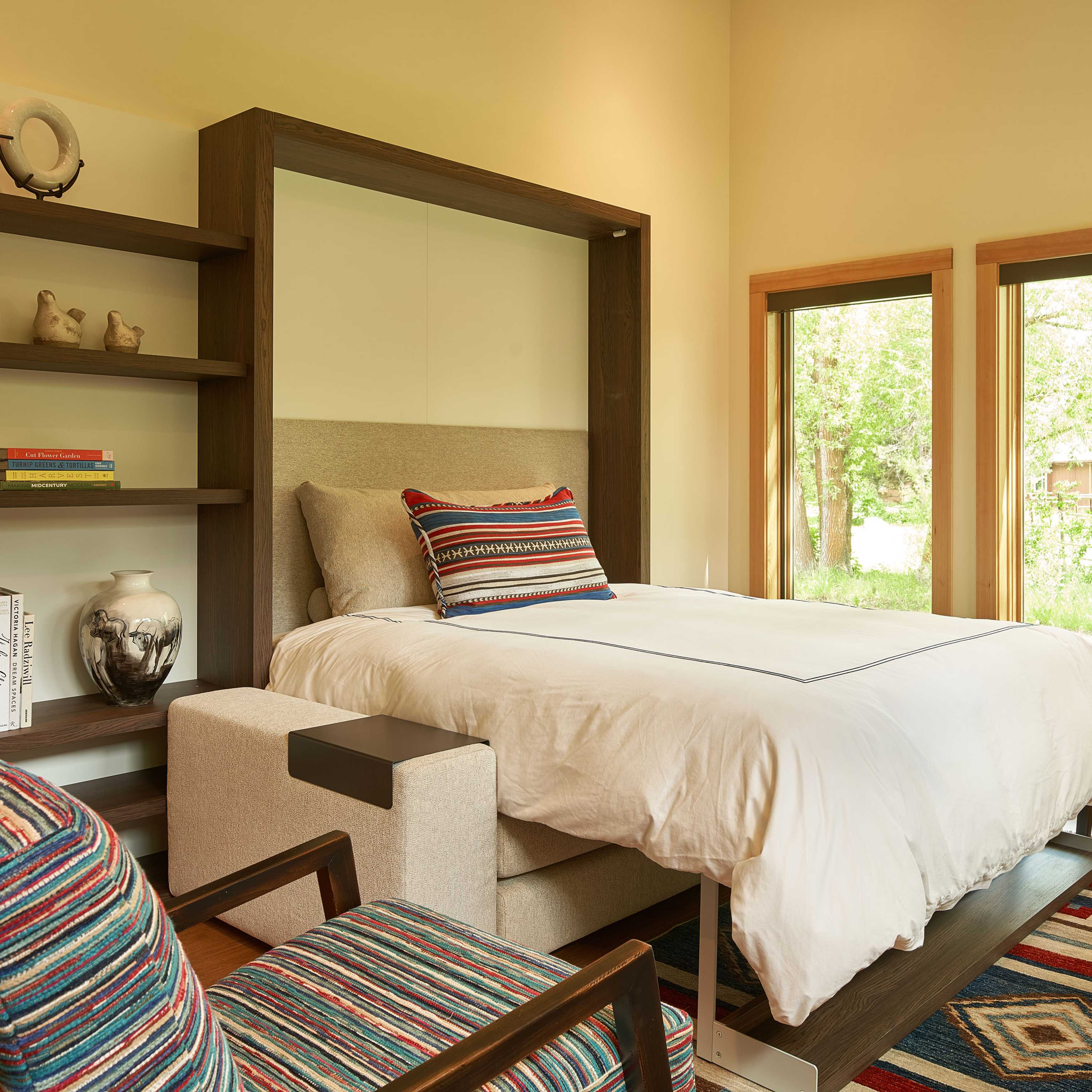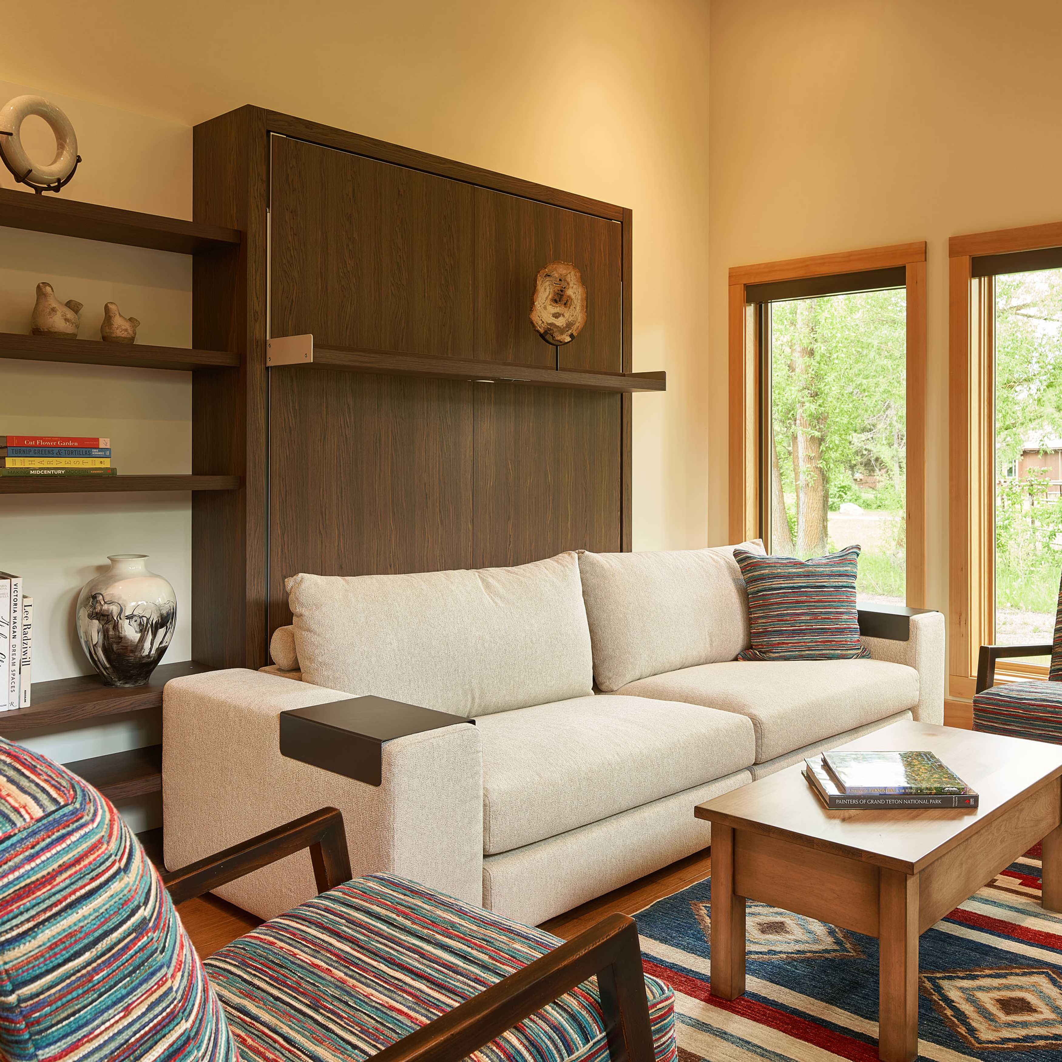 COLOR!! Our design started by adding pattern and color to the blank palette with bright area rugs that grounded the spaces. In the large great room, we created an architectural focal point with the linear fireplace and built-in bench and shelves. This provided a comfortable area for our clients to entertain guests. The comfortable furnishings throughout this spacious residence were a mix of modern, industrial, and retro-inspired. The contemporary western artwork brought in just the right amount of Jackson Hole flavor.