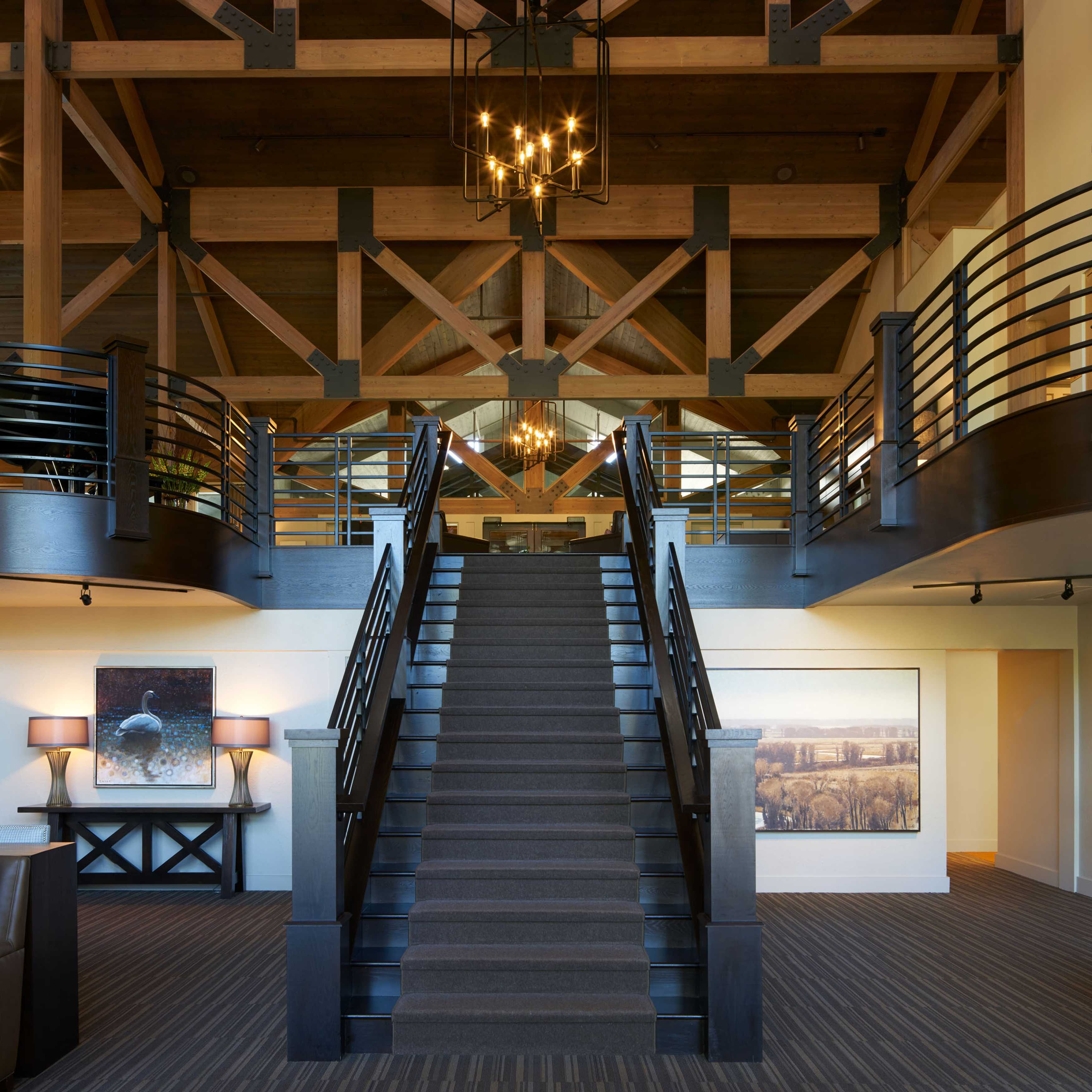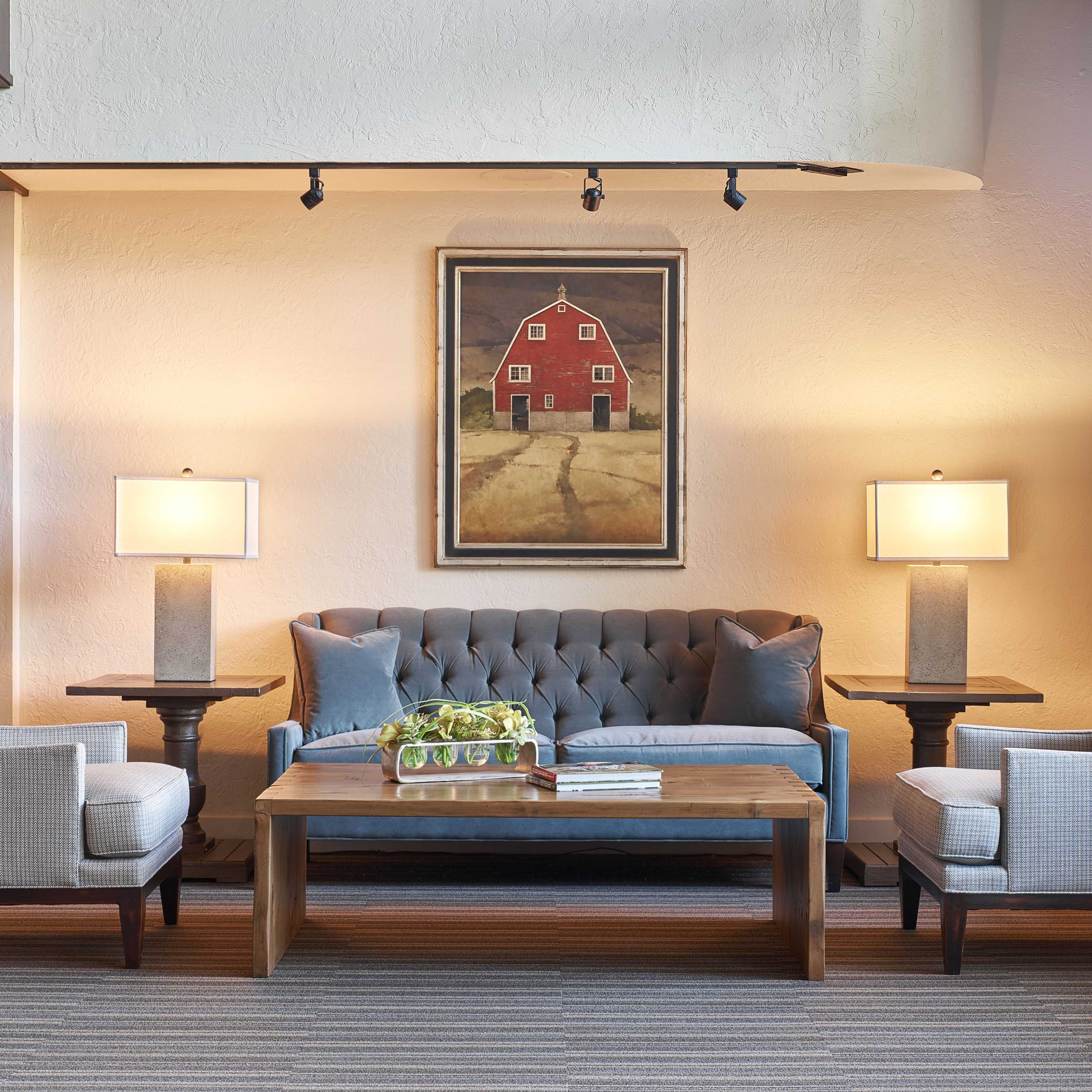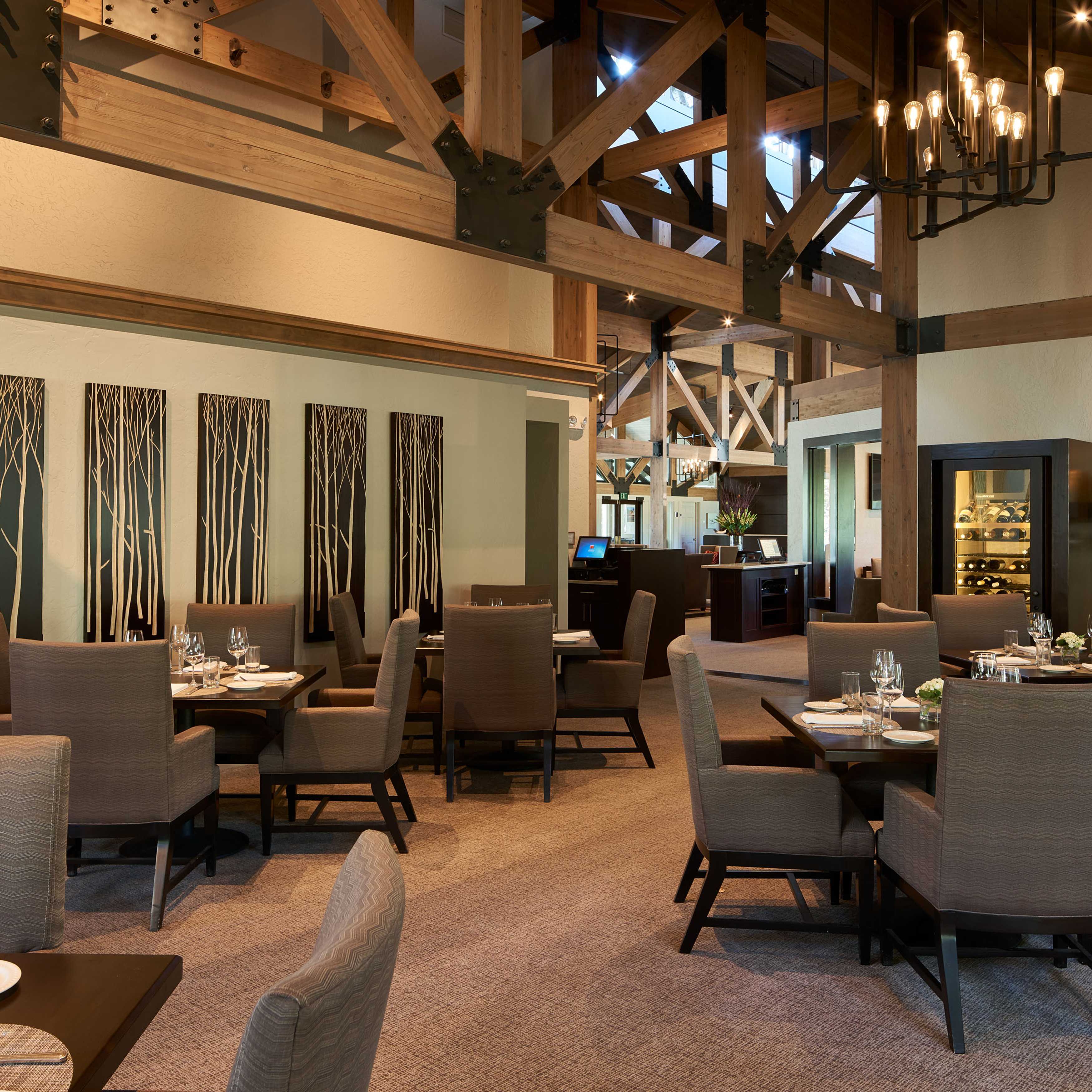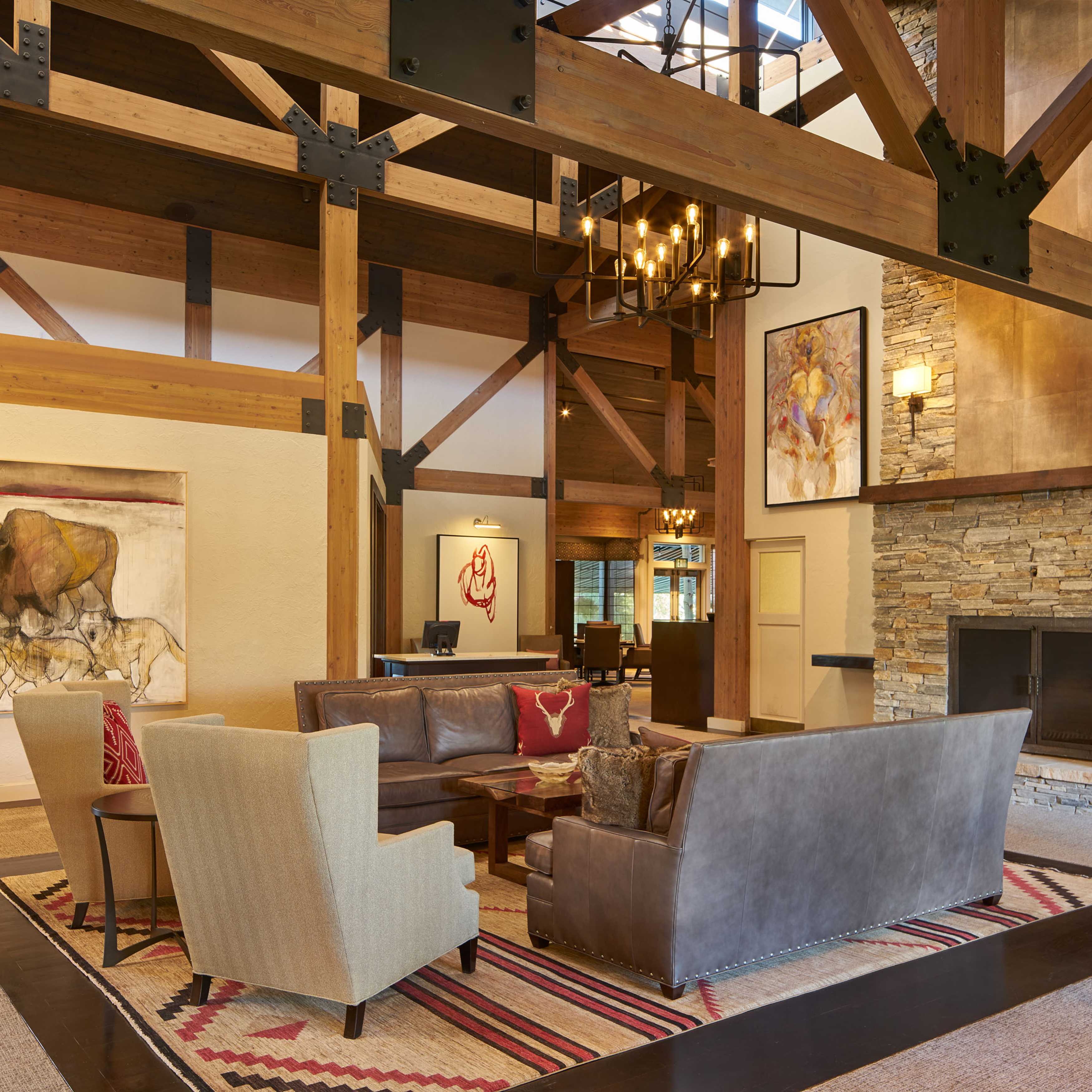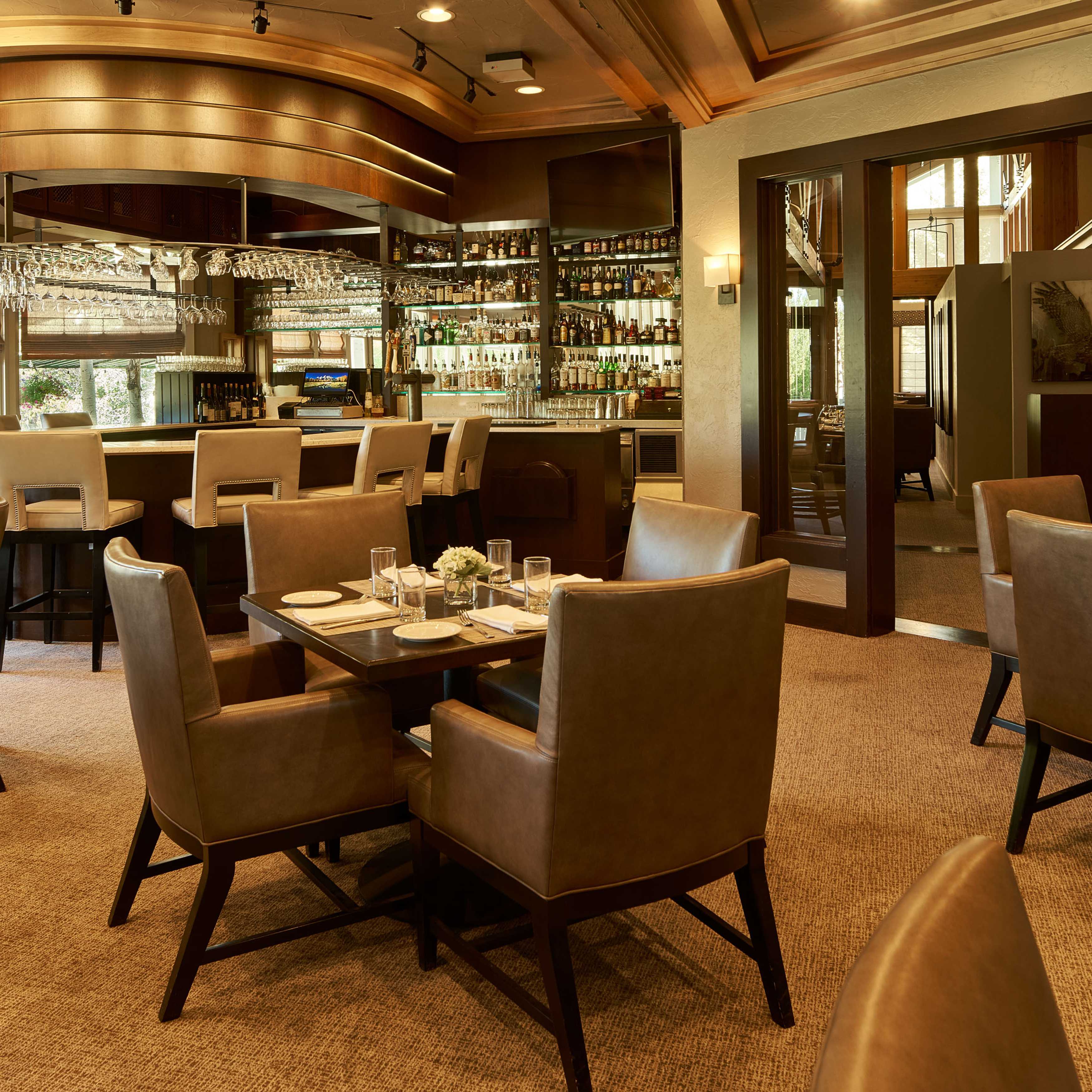 The members of Teton Pines were on a mission. They wanted to transform their traditionally adorned clubhouse into a transitional mountain retreat for current and new members. As is true with all commercial projects, adhering to a budget that allowed them to get the most value for their investment was extremely important. To help with costs, we kept the floor plan of the clubhouse the same but added more contemporary architectural elements and furniture with a warm taupe/red color palette. The dated river rock fireplace was replaced with a contemporary stacked stone. The bar was updated by refacing the perimeter in beautiful dark walnut, adding a crisp off-white veined quartz top, and installing a locally made custom-designed floating iron glass rack above the bar. The furnishings were replaced with sturdy, contemporary pieces that allowed their members to enjoy intimate spaces for dinner and cocktails.