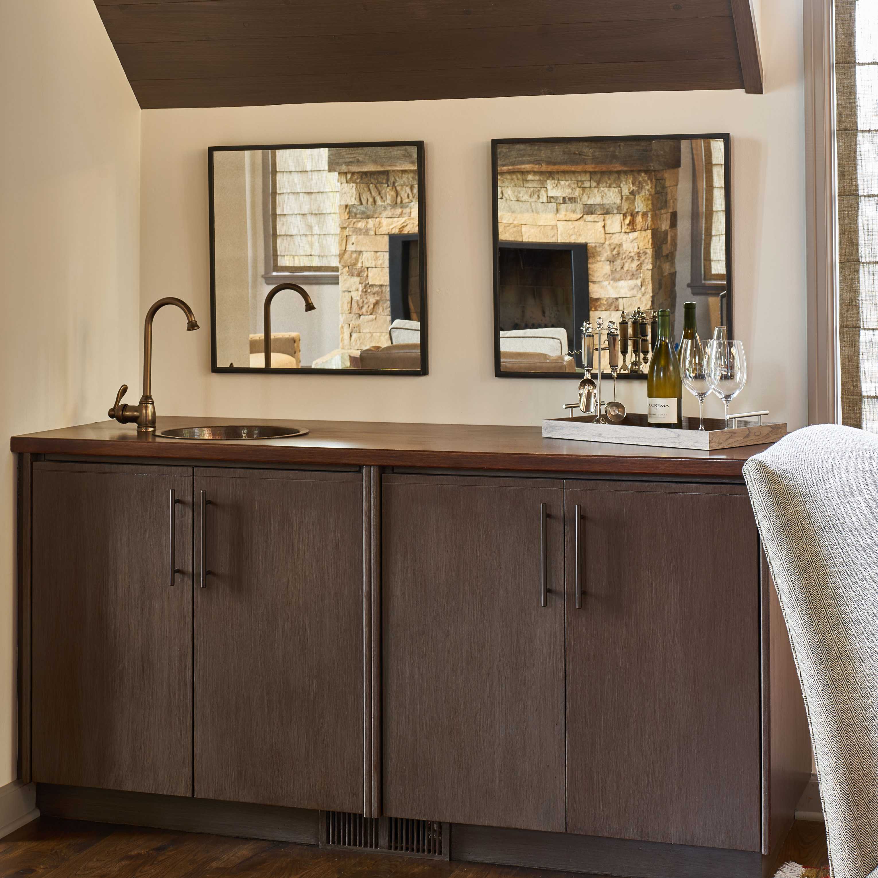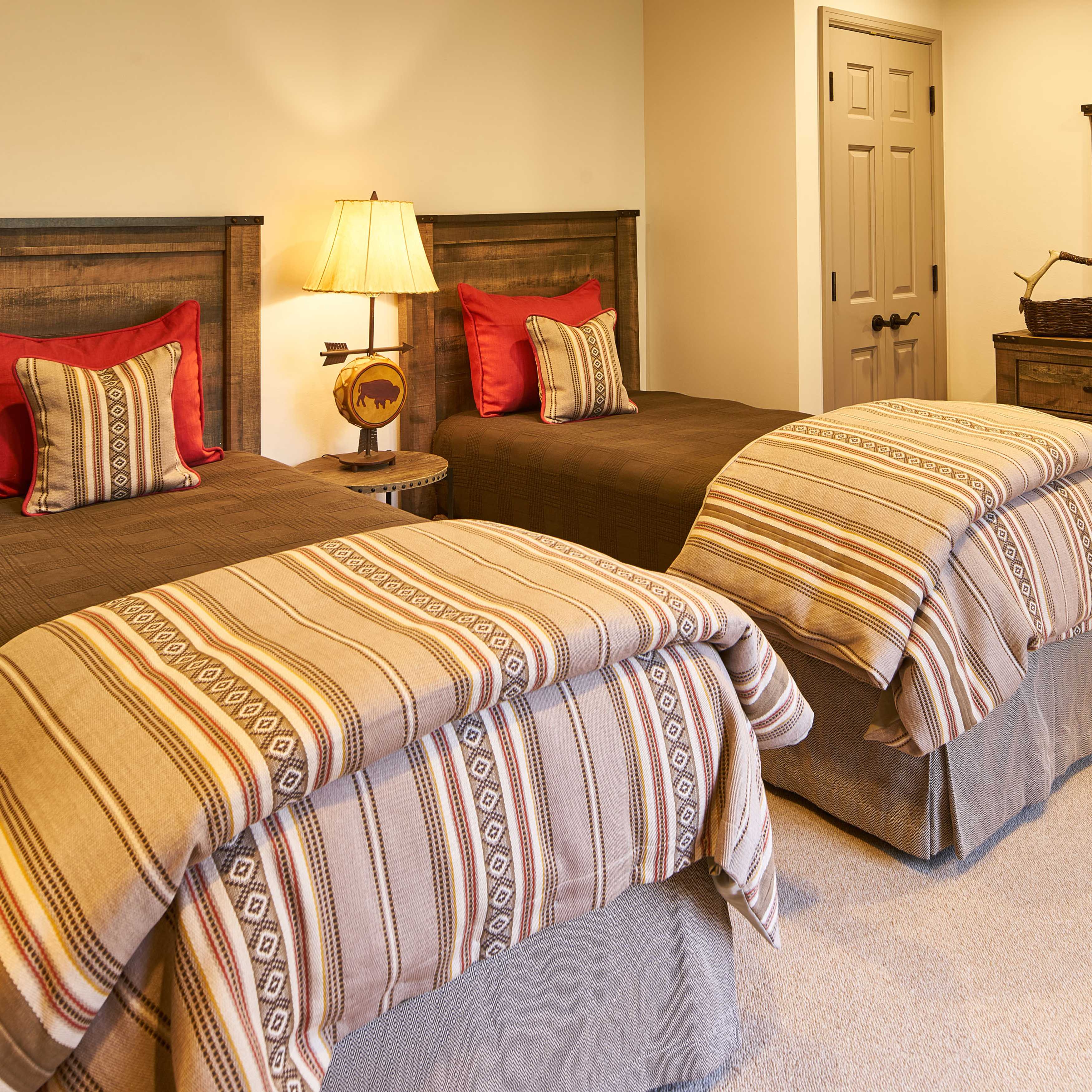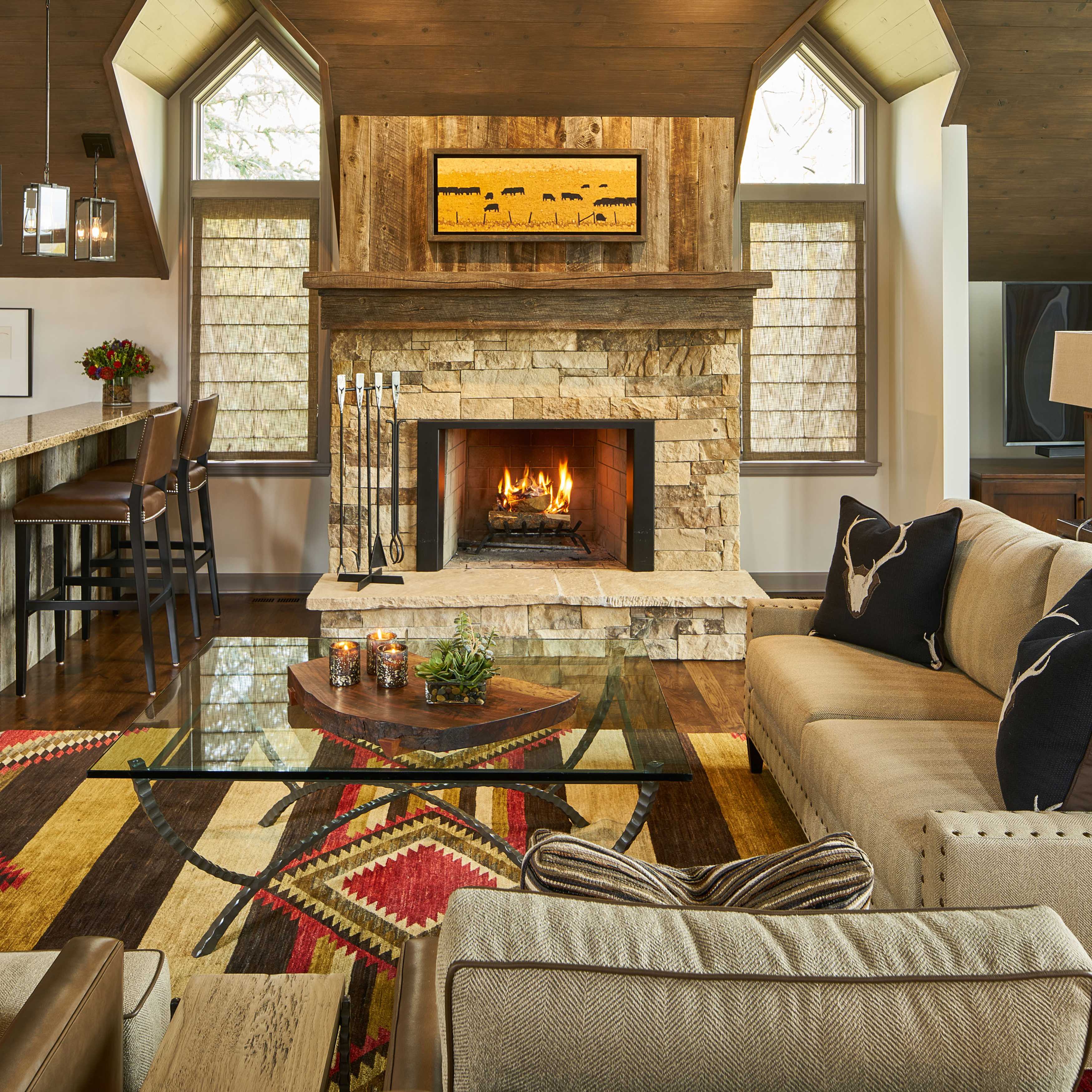 This 4,500 square ft. Teton Pines Cluster Unit was completely remodeled to give this dated residence a completely new transitional mountain feel. The unsightly yellow pine wood was stained either gray or chestnut brown and combined with a crisp fresh paint job made the entire space feel lighter and more open. The custom built-ins, new fireplace, new stair railing, and updated bathrooms helped to redefine the entire residence. The carefully selected furnishings are brought together with the space-defining contemporary western-inspired wool rugs that were sourced from a local rug gallery.