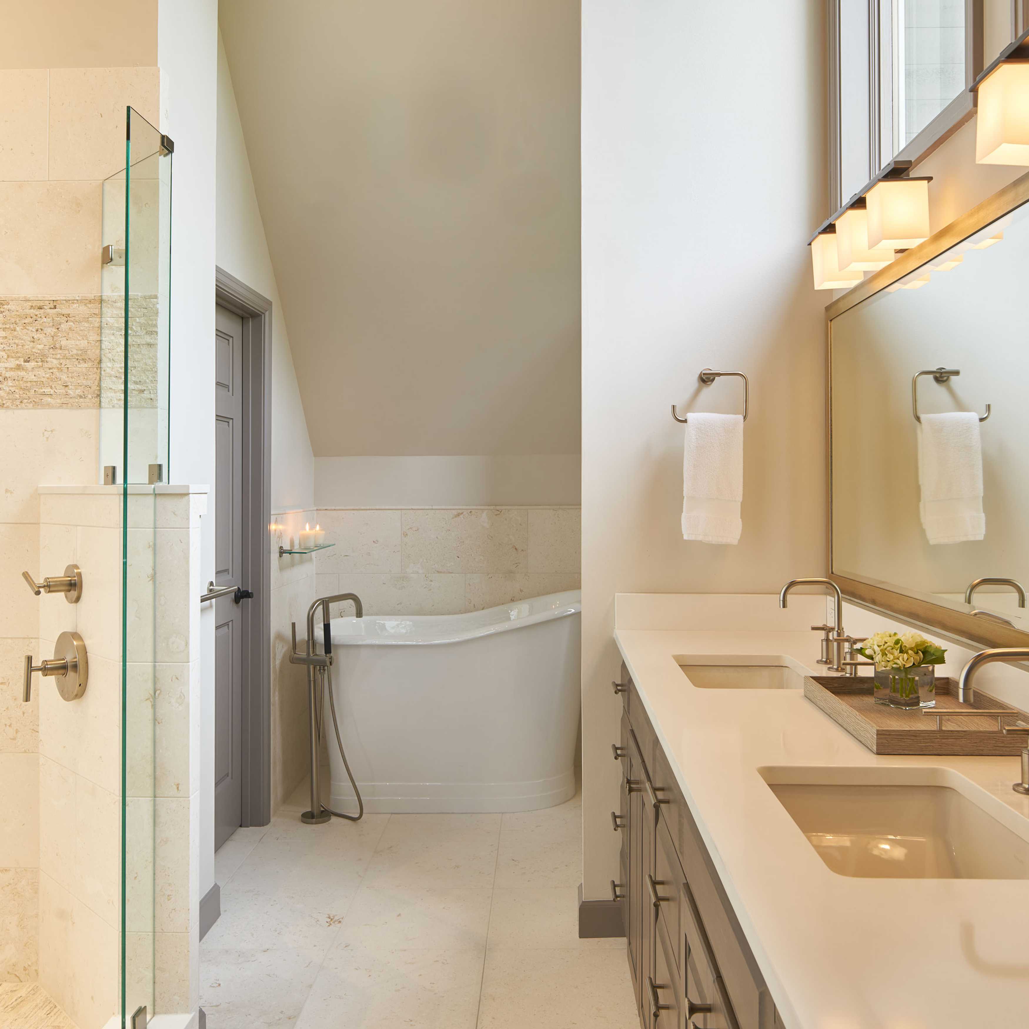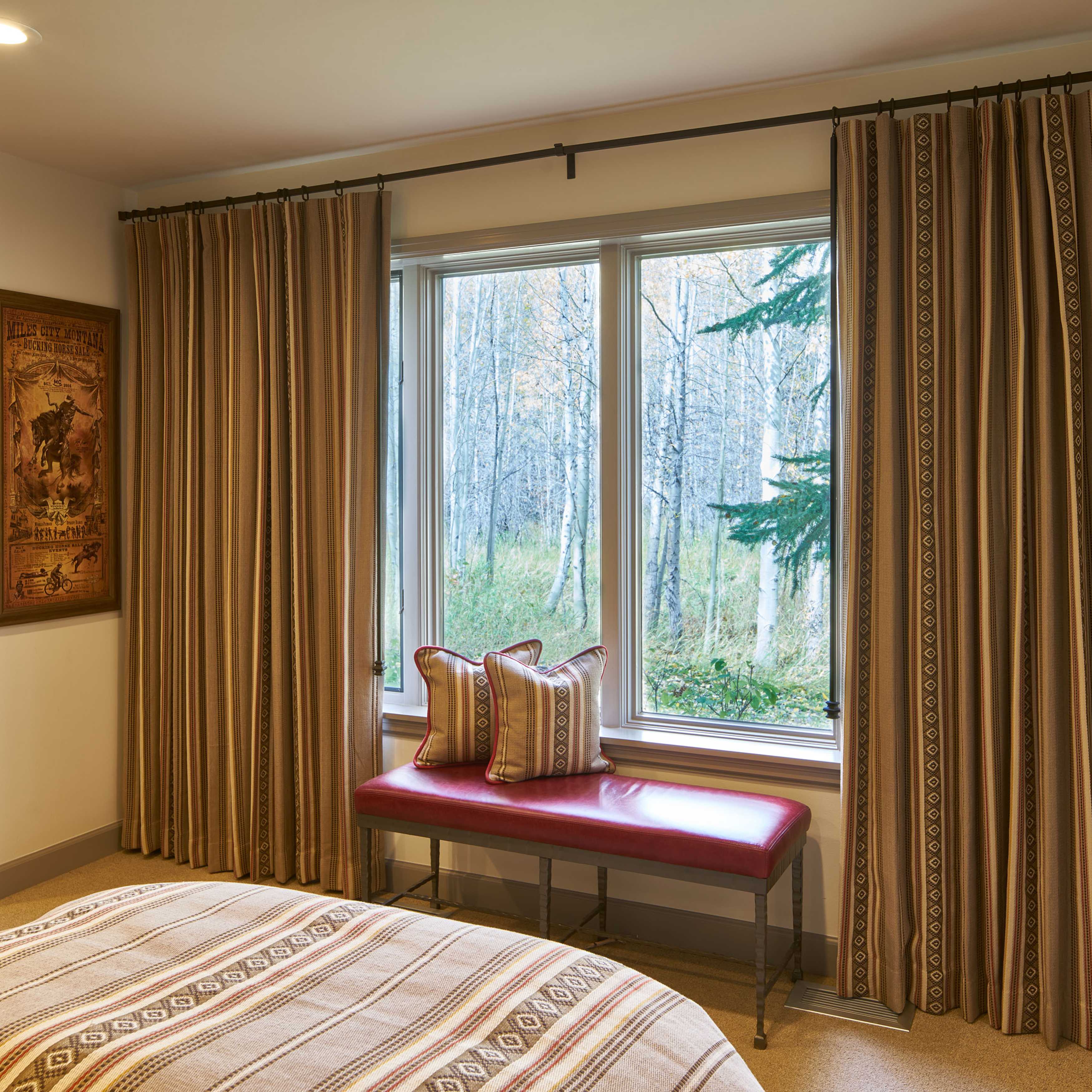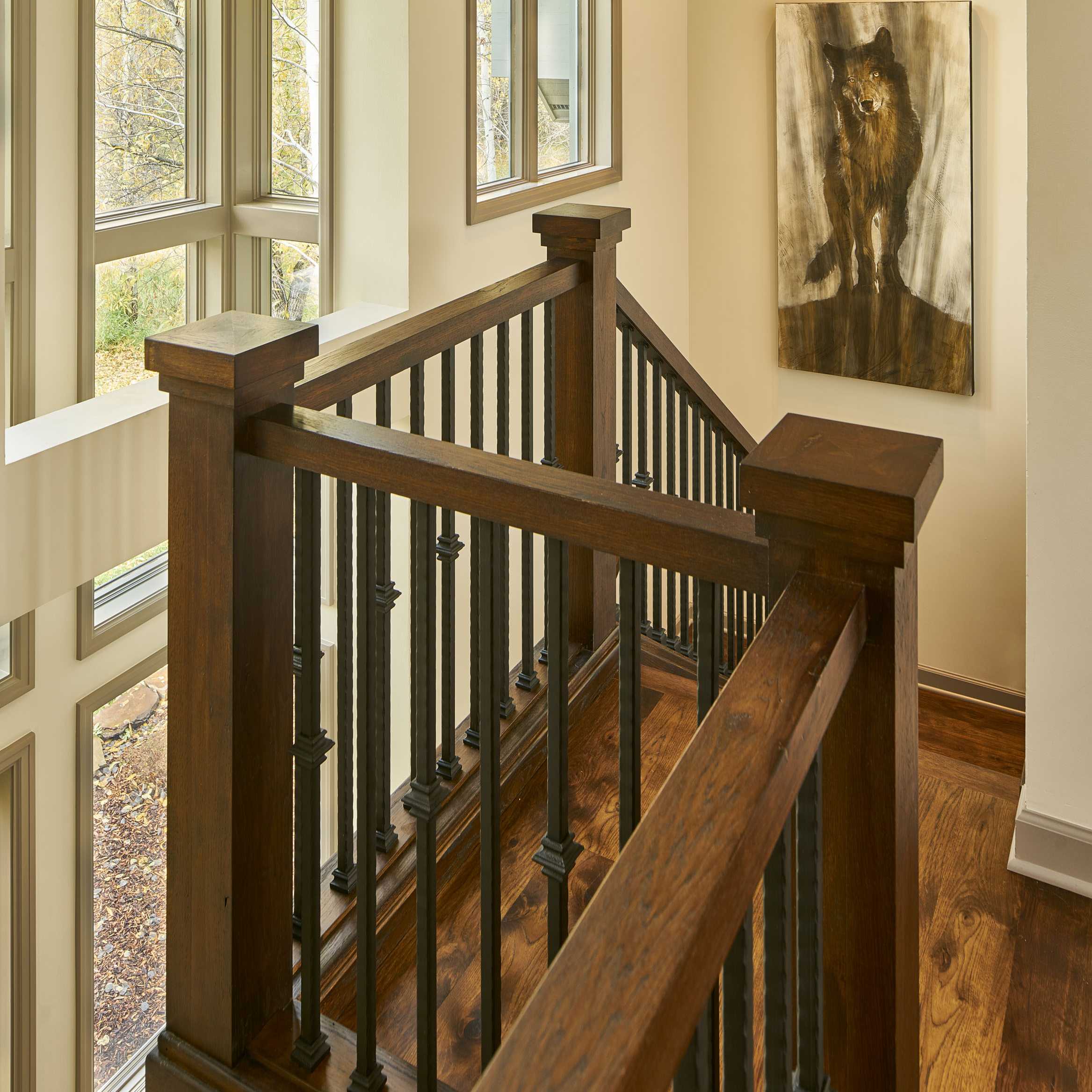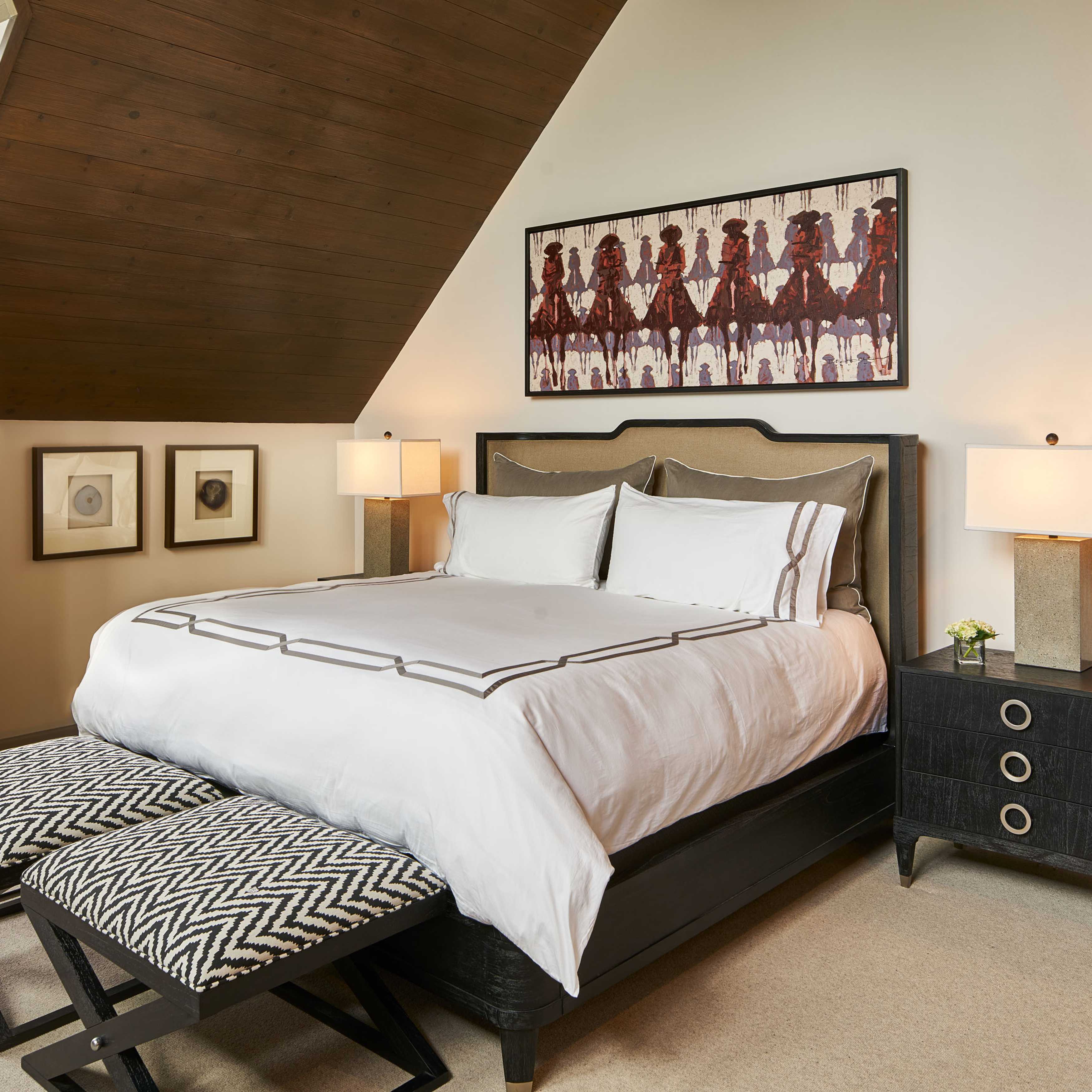 This 4,500 square ft. Teton Pines Cluster Unit was completely remodeled to give this dated residence a completely new transitional mountain feel. The unsightly yellow pine wood was stained either gray or chestnut brown and combined with a crisp fresh paint job made the entire space feel lighter and more open. The custom built-ins, new fireplace, new stair railing, and updated bathrooms helped to redefine the entire residence. The carefully selected furnishings are brought together with the space-defining contemporary western-inspired wool rugs that were sourced from a local rug gallery.